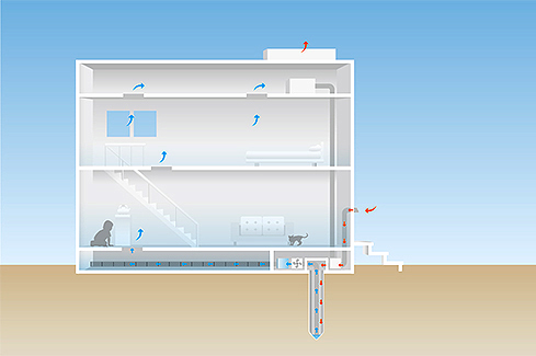 エアコンのように急激に温度を調整するのではなく、換気をしながら建物全体の温度を緩やかに調整し、冷暖房の空調負荷を軽減します。GEOパワーシステムは多機能型換気システムでエアコンではありませんので、温度の設定は必要としていません。熱源はあくまでも「自然」。自然の力をそのまま利用し、建築手法や工夫によってそれを最大限に活かすシステムです。